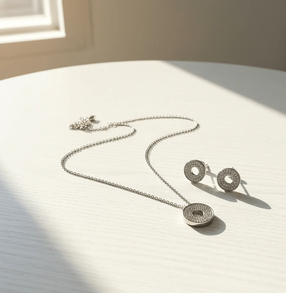 طقم مجوهرات مصمم ببراعة فائقة، يتألف من قلادة دائرية متلألئة من الزركونيا المكعبة، وأقراط أنيقة متناسقة . صُمم هذا الطقم ليناسب الاستخدام اليومي والمناسبات الخاصة، فهو يجمع بين البساطة العصرية واللمعان الفاخر. متوفر باللونين الذهبي والفضي ، ويكمل جميع إطلالاتك بكل سهولة.